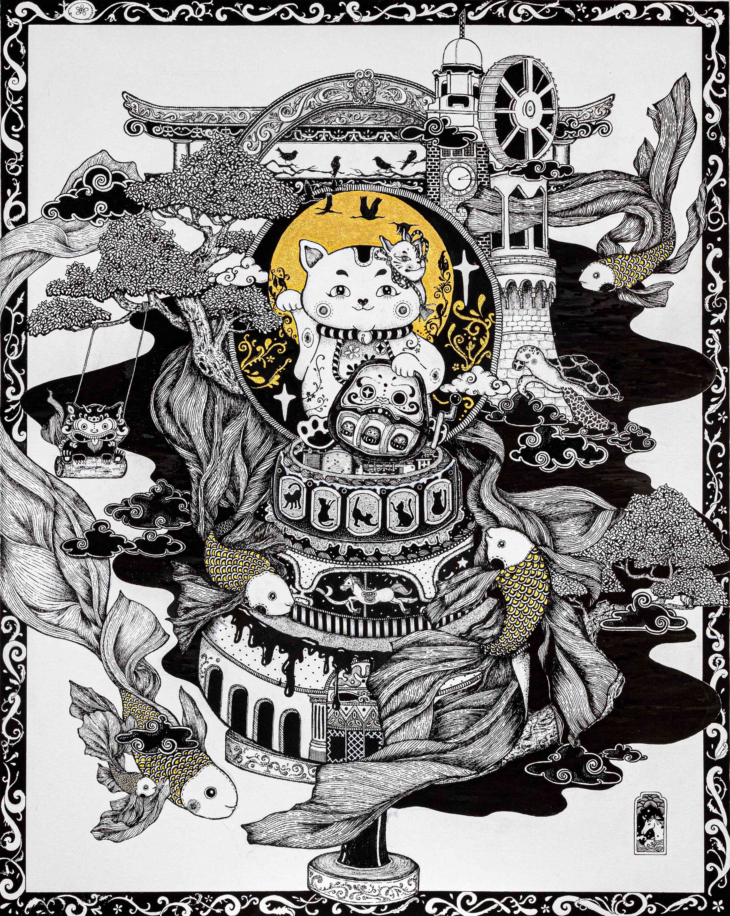 本次展览延续艺术家标志性的黑白金色针笔风格,透过细腻线条与对比色调,构筑出一系列充满诗意的视觉景象。展览并特邀本地跨界艺术工作者李霭玑担任策展人。除呈现Aka C.标志性的纸本针笔作品,亦将首度展出她运用不同画布与颜料创作的全新系列,更特别创作了12幅以招财猫融合十二生肖为主题作品,并同步推出限量艺术复制画。