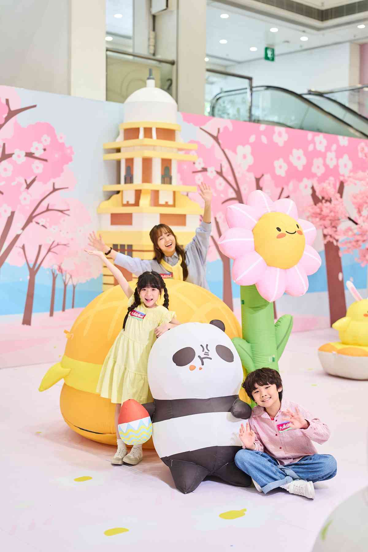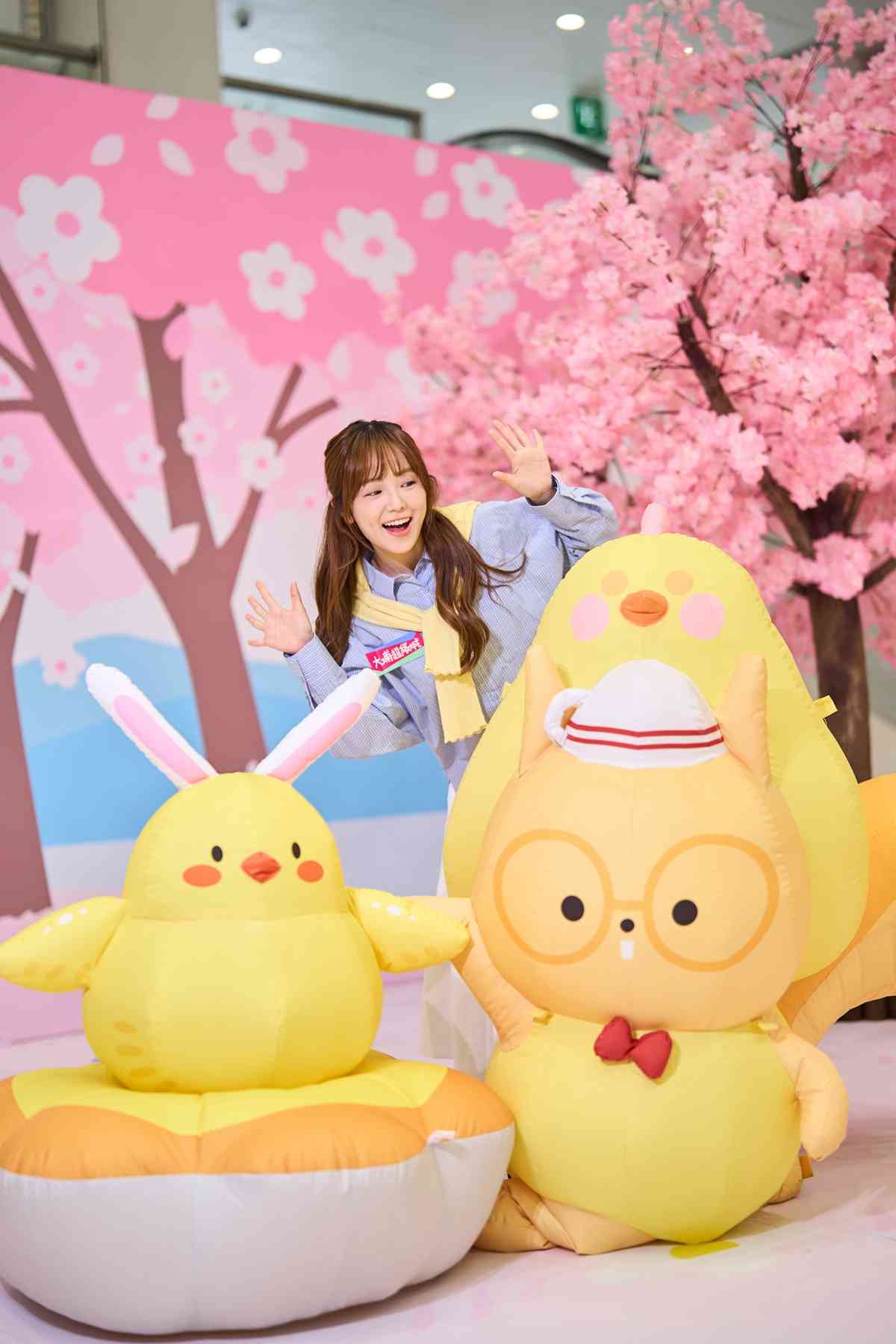 四位可爱卡通人物来到大埔超级城地下C区舞台,将会换上特色装扮,与大家于樱花海中、钟楼之下共度佳节。导游兔仔「扎扎跳」正手持樱花、骑着汽车来到找寻巨大蛋挞。副导游松鼠「萌茶茶」精心打扮,穿上小鸡装束,与主角之一的黄色小鸡等候大家光临。摄影师「白雪雪」藏身于半开的蛋中视察环境,调整好角度画面,为摄影做好准备。司机熊猫「事事淡」以巨型菠萝包作为枕头,一边大啖品尝烩番薯,一边闭目为驾驶养足精神。欢迎各位团员与四位卡通人物打卡,记下最富香港色彩又可爱爆棚的春日美景。