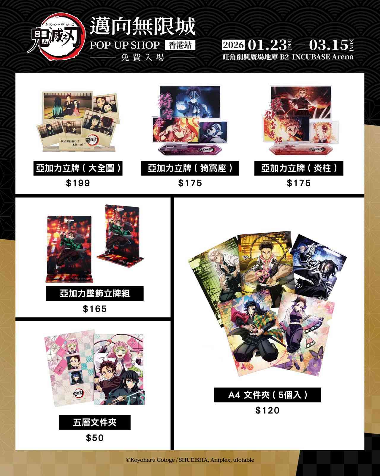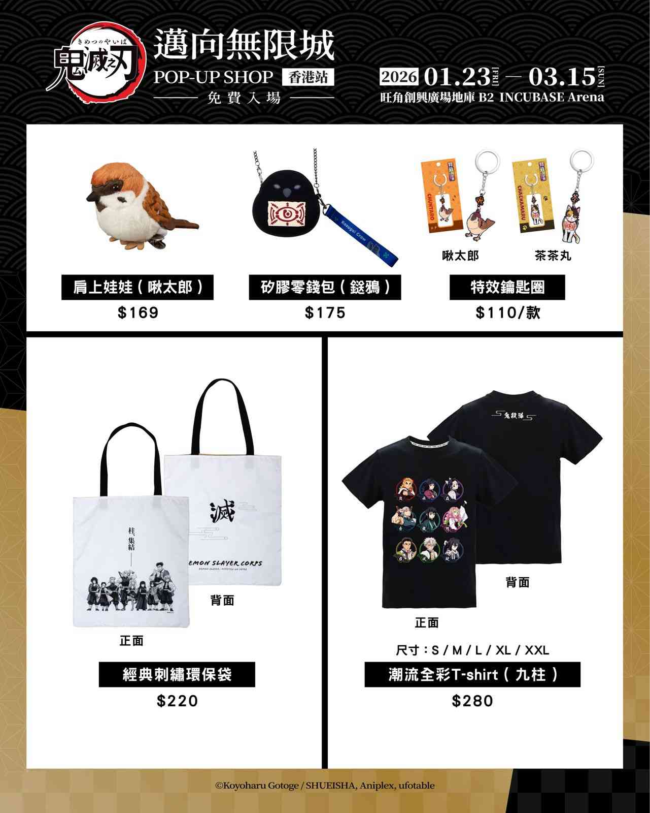 同場快閃店推出多款以《無限城篇》及「九柱」為主題的香港限定及日本直送周邊商品,包括 T-shirt、角色亞加力立牌、滑鼠墊、日輪刀鑰匙圈、刺繡環保袋等。