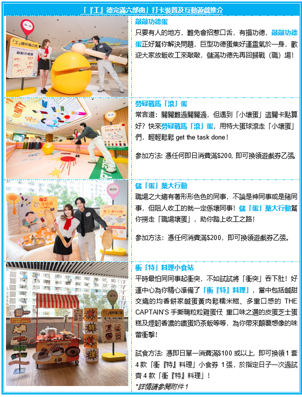 只想返9放6,但總被煩人煩事纏身?好運中心深明一眾社畜心聲,打造了【扮工不搗蛋EGG PARTY】,當中的「工」德完滿六部曲讓打工仔們齊齊認真「扮工」!當中包括幫你儲滿功德讓你重新出發的敲敲功德蛋、令「小壞蛋」滾蛋的勞碌戰馬「滾」蛋及撈走「職場壞蛋」的儲「蛋」藥大行動、為免與同事產生口舌之爭的衝「特」料理、補充社畜comfort food 的扮工不搗蛋!市集及為奇難雜症提供幽默指引的答案之書 – office篇,一連串互動體驗,讓社畜們在笑聲中釋放壓力,迎接每一天的職場挑戰。