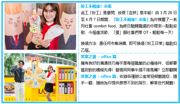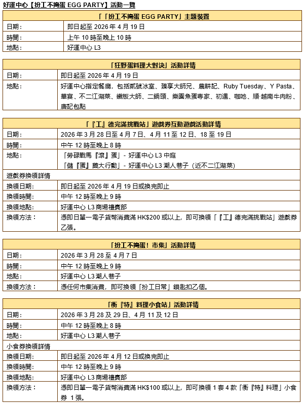 打工仔最怕同事「搬龍門」,想將彈出又彈入的同事「蛋」出你的世界?機會嚟啦!由即日起至4月19日,好運中心號召全港社畜齊齊放低工作煩惱,舉辦【扮工不搗蛋EGG PARTY】,商場搖身一變成社畜的快樂避難所!作為快樂基地,好運中心貼心為你準備了全港首個狂野蛋料理大對決,以試蛋價嘆多款創意蛋系美食,社畜們即場為自己recharge,才有力重返職場!另外,好運中心特設「工」德完滿六部曲,集玩味打卡、特色市集於一身 — 想要敲敲功德蛋儲功德又得,抑或玩儲「蛋」藥大行動及勞碌戰馬「滾」蛋令小壞蛋們「滾」蛋亦得,讓社畜們自製comfort zone!發現跟同事們難以溝通?現場更設有答案之書 – office篇,解答一眾打工仔的疑難雜症,下一站為你送上衝「特」料理,直接衝擊味蕾與想像!最後當然不可以錯過扮工不搗蛋!市集,為你搜羅一系列社畜comfort food,勇敢面對職場!