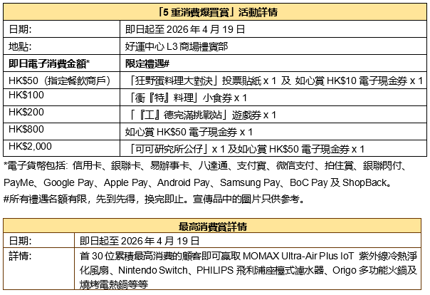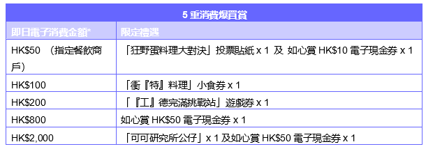 「5重消費爆買賞」及「最高消費賞」賞逾HK$40,000電子現金券及獎品
