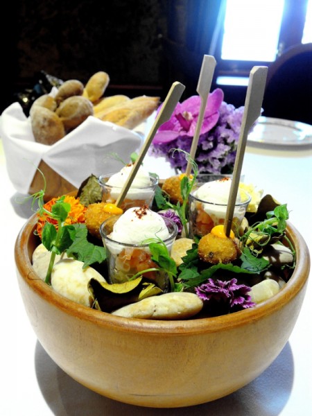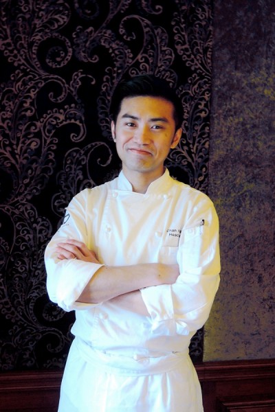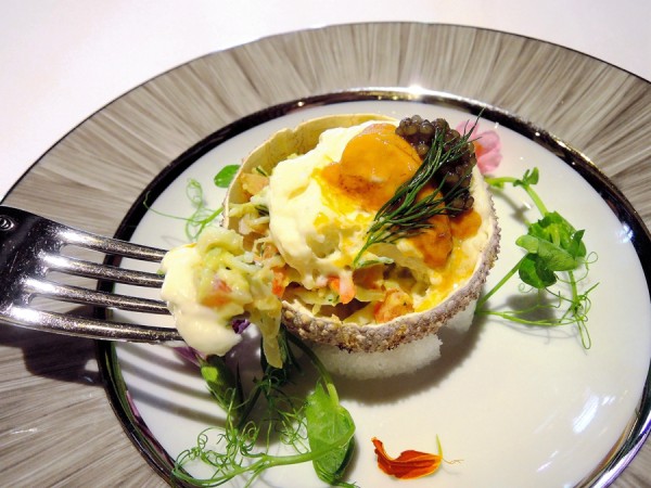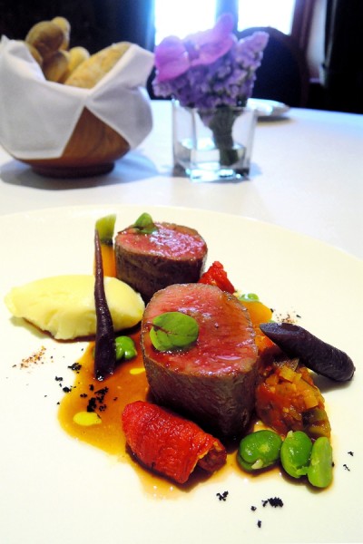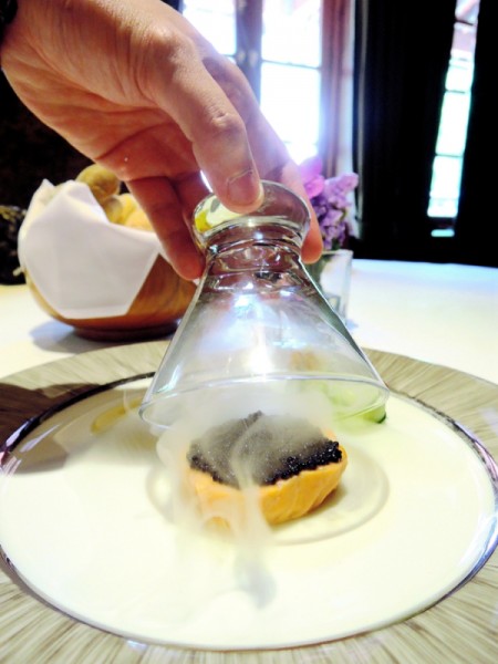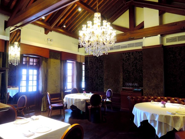 穿越名店,走到Hullett House海利公館,沿石板樓梯拾級而上,走到1樓的St. George的Fine Dining廳房,高聳的拱頂天花,水晶燈映照紅棕實木裝樑,綴以皮革沙發、絨布窗簾,洋溢舊時代的英式韻味,沒有過度張揚的氣焰,氣氛悠閒舒適,繃緊的心情頓時放鬆下來,正好預備了享受法國菜的心情。